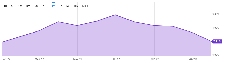 General sentiment in the US overall financial markets is wary, with more signs of their economy slowing down as the Federal Reserves rate hikes start to have effect. The (oversimplified) summary of their plan is that by increasing the cost of borrowing money, everyone will start to spend less and the demand for good and services will decrease, which will reduce their problematic inflation. It seems to be working, and the American factory sector is now at its weakest in 31 months, and now contracting. The giant US services sector is actually shrinking at a faster pace. The good news is that it seems to be reducing inflation you can see below:
