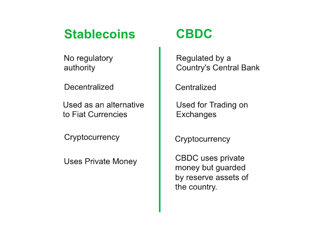Warning: It's important to note that stablecoins differ from Central Bank Digital Currencies (you can read about CBDCs in a previous post here). CBDCs are digital representations of a country's fiat currency issued by its central bank. While both stablecoins and CBDCs aim to provide stability, CBDCs are controlled and regulated by central banks, whereas stablecoins are typically issued by private entities or decentralized protocols. See below: