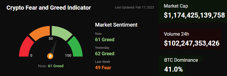 Sentiment up to 61/100 (low levels of greed) following the surge in prices. I expect traders to be taking profits prices to head back down a bit, and sentiment to oscillate around 50ish for awhile