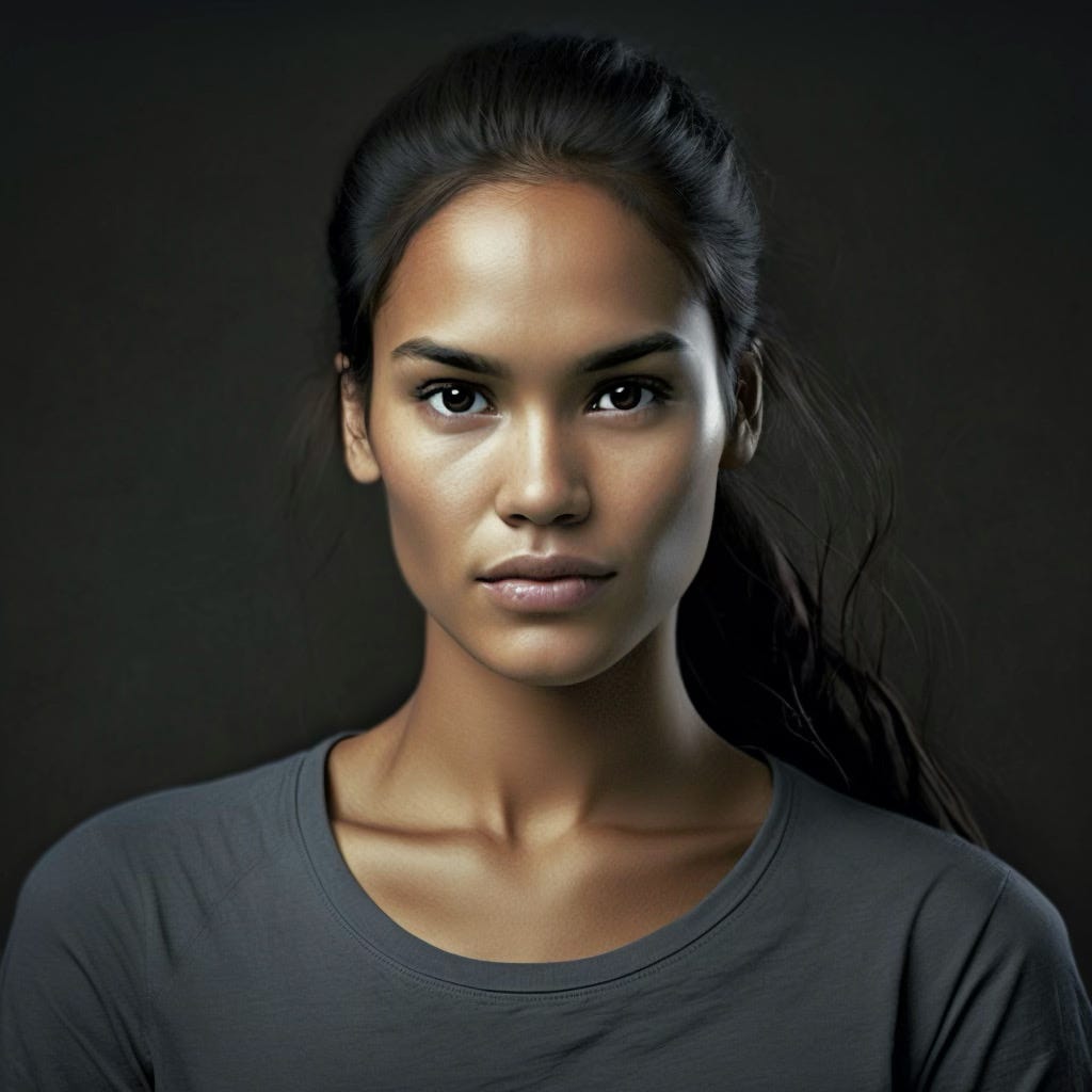 First I used Midjourney (free trial) to create a face. I used the prompt" “imagine a medium shot of a young woman, captured with a Nikon D850 and a Nikon AF-s NIKKOR 70-200mm f/2.8E FL ED VR lens, lit with high-key lighting to create a soft and ethereal feel, a shallow depth of field”: