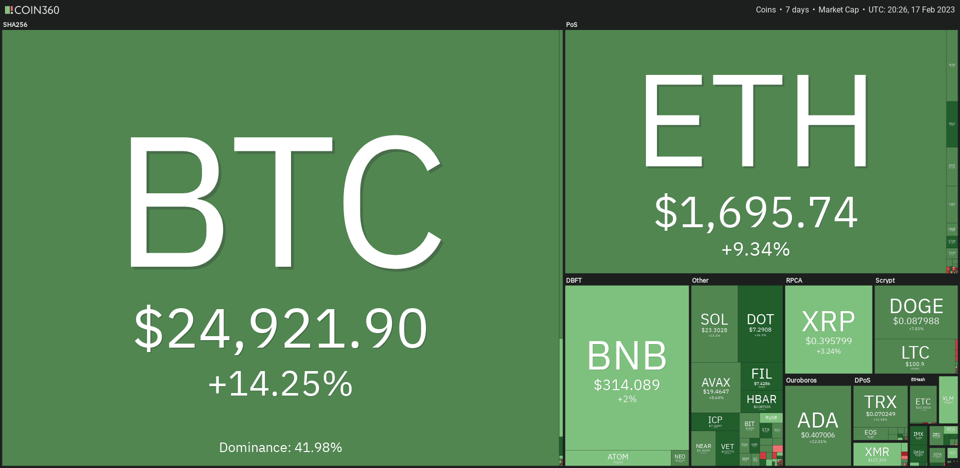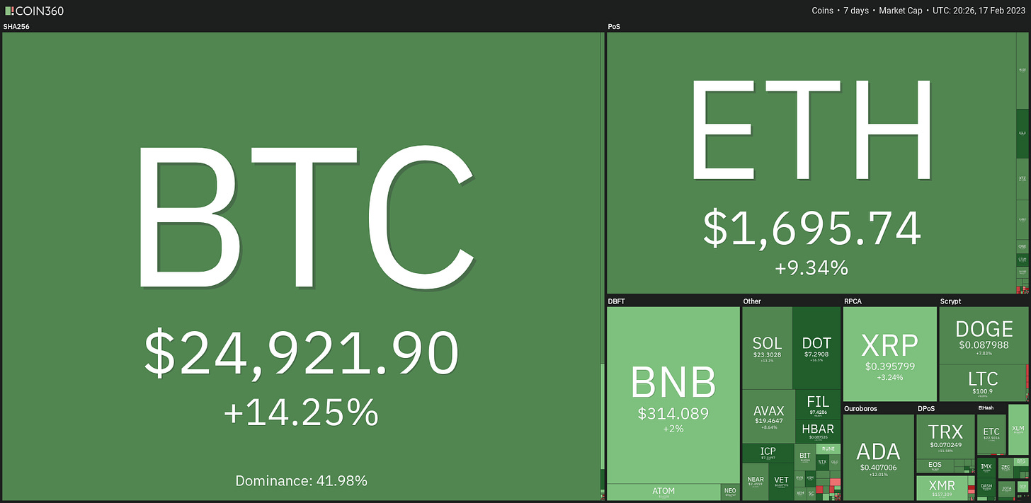 🗺️ Heatmap shows the crypto market’s surge over the last week (size of the blocks are market share, colour & % show the change over the last week)
