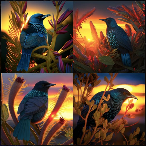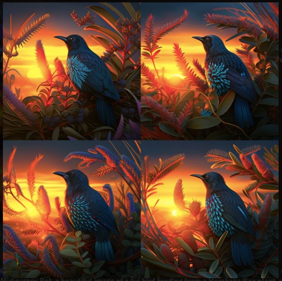 It created 4 images, not exactly Tuis or harakeke but still pretty nice: