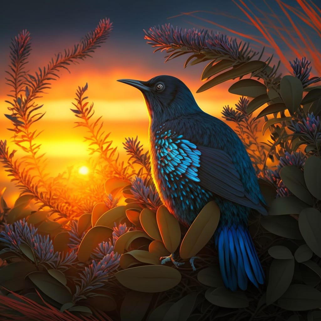 I asked the bot to generate “a beautiful image of a tui bird feeding from a Harakeke flax plant, with the sun setting in the background”