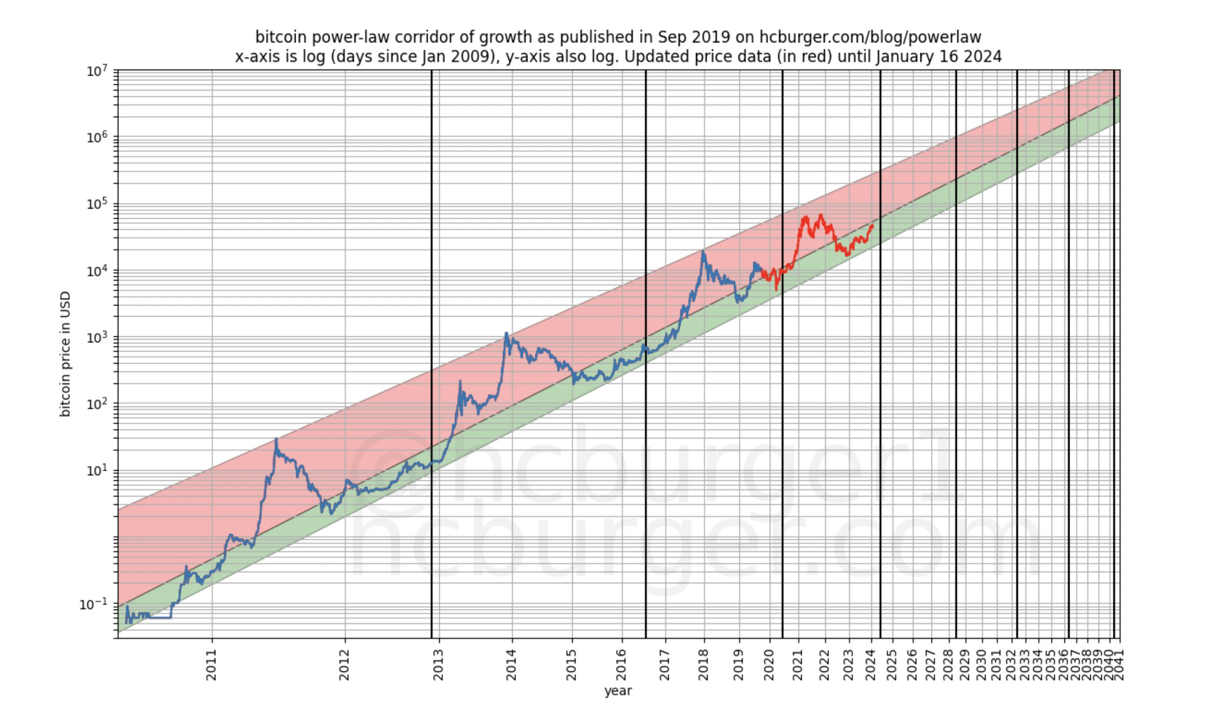 Lots of buzz about the Bitcoin price model called the "Bitcoin Power Law" that proposes a logarithmic scale to predict long-term price trends. Developed by astrophysicist Giovanni Santostasi, the model suggests a linear relationship, resembling nature's power laws. Santostasi's algebraic expression predicts Bitcoin reaching $64,564 soon and peaking at $210,000 in January 2026, followed by a dip to $60,000. Despite skepticism and comparisons to other models, Santostasi envisions Bitcoin at $1 million by 2033, emphasising its growth to analogous to a city rather than indefinite exponential growth.