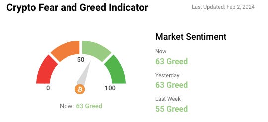 🎭 Crypto Fear and Greed Index is based on volatility, social media sentiments, surveys, market momentum, and a few other bits and pieces. Back firmly in the greed zone.