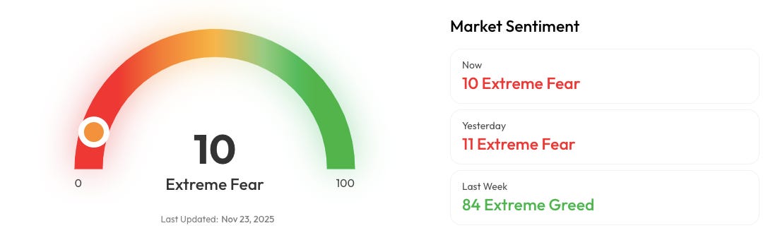 🎭 Crypto Fear and Greed Index is an insight into the underlying psychological forces that drive the market’s volatility. Sentiment reveals itself across various channels—from social media activity to Google search trends—and when analysed alongside market data, these signals provide meaningful insight into the prevailing investment climate. The Fear & Greed Index aggregates these inputs, assigning weighted value to each, and distils them into a single, unified score.