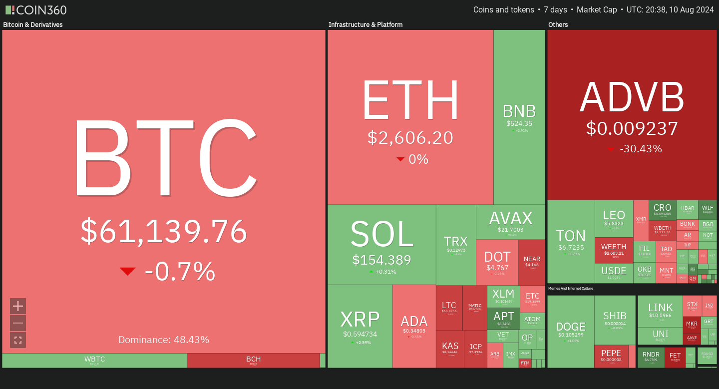 🔥🗺️ 7-day heatmap below, showing the current share of the market for the top cryptocurrencies, and their change in price over the last week.