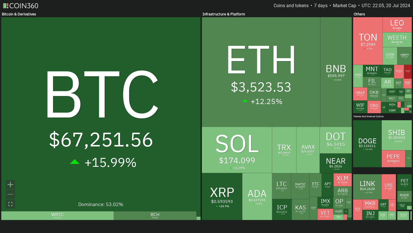 🔥🗺️ 7-day heatmap below, showing the current share of the market for the top cryptocurrencies, and their change in price over the last week.