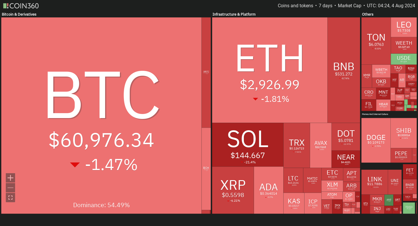 ๐ฅ๐บ๏ธ 7-day heatmap below, showing the current share of the market for the top cryptocurrencies, and their change in price over the last week. Lots of red this week ๐๐ฉธ