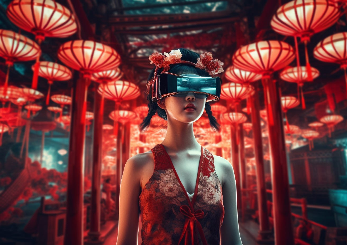 Image conjured in MidJourney, prompt: “china themed metaverse, immersive digital experience --ar 14:10”