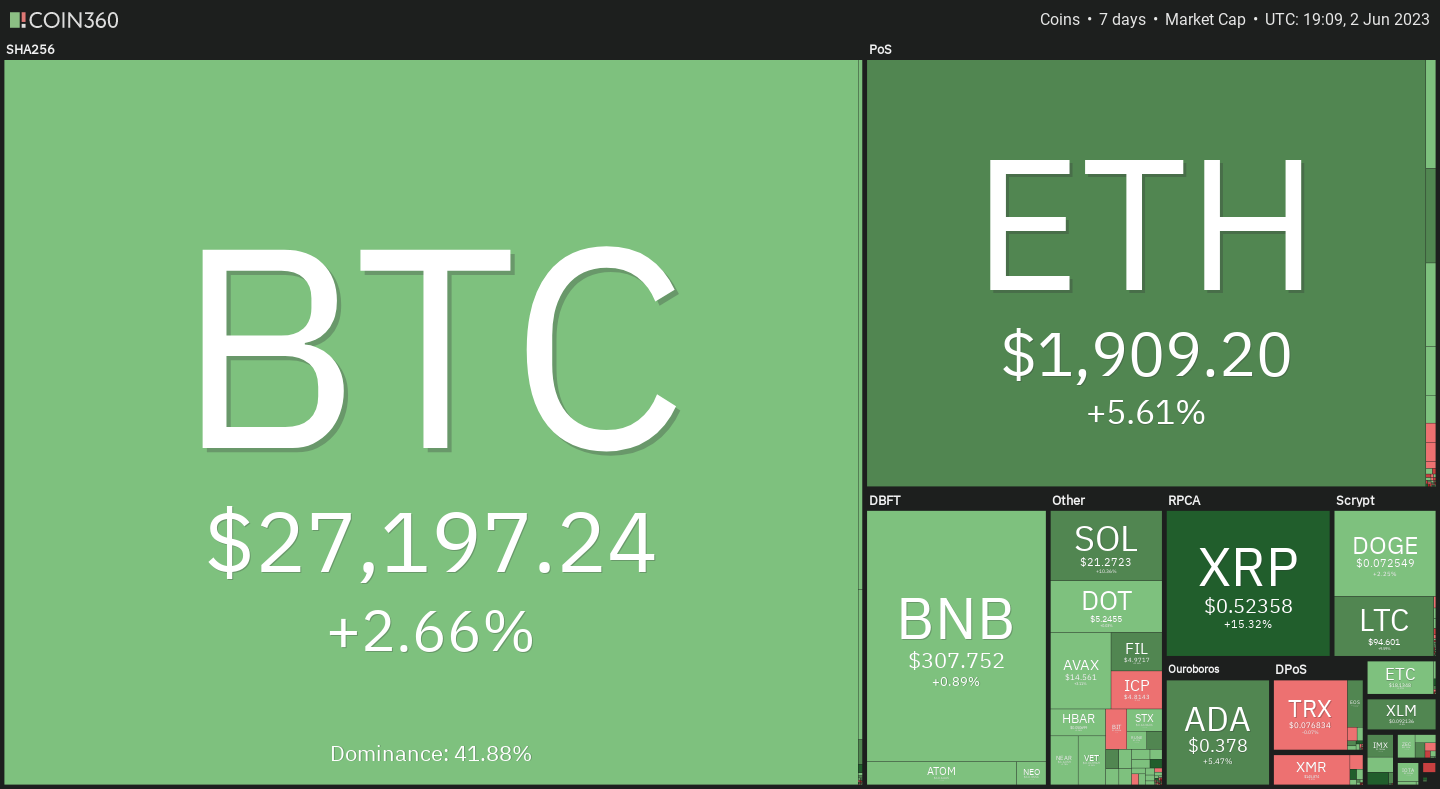 7-day Crypto Heatmap below shows a strong week, especially for Ethereum (size of the blocks are market share, colour & % show the change over the last week)