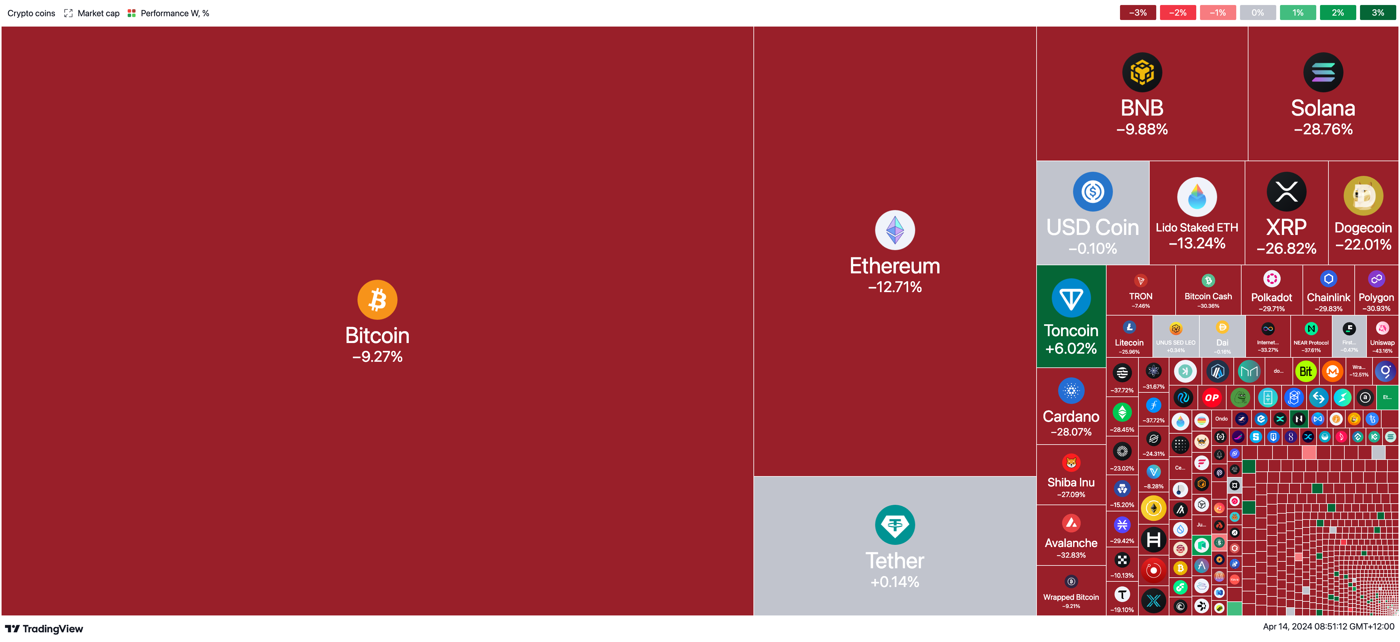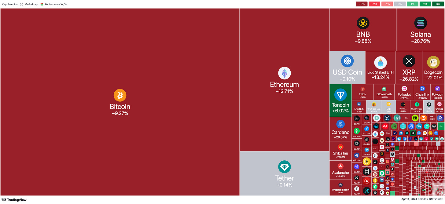 🔥🗺️ 7-day heatmap below, which shows the current share of market for the top cryptocurrencies, alongside total marketcap (USD) and the change in price over the last week. Lots of red!