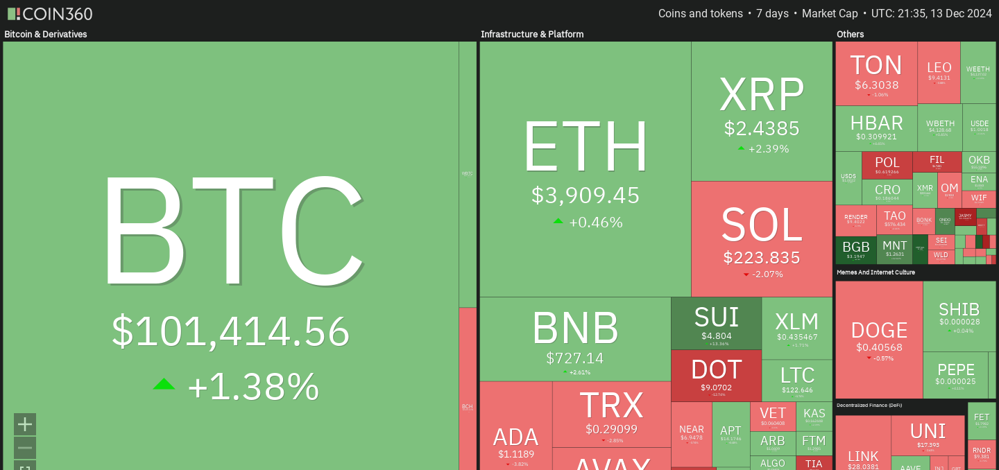🔥🗺️ 7-day heatmap below, showing the current share of the market for the top cryptocurrencies, and their change in price over the last week.
