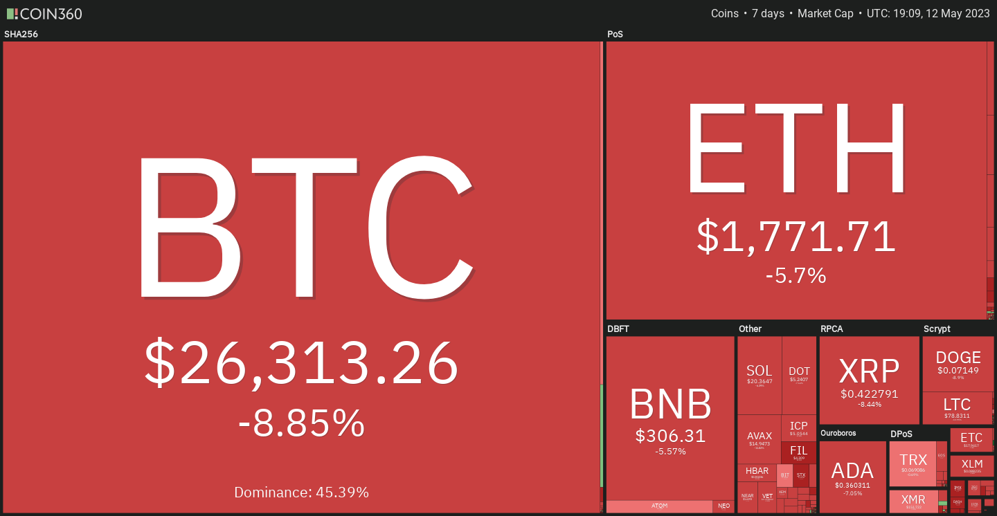7-day Crypto Heatmap below shows the pullback after the bumpy week (size of the blocks are market share, colour & % show the change over the last week)