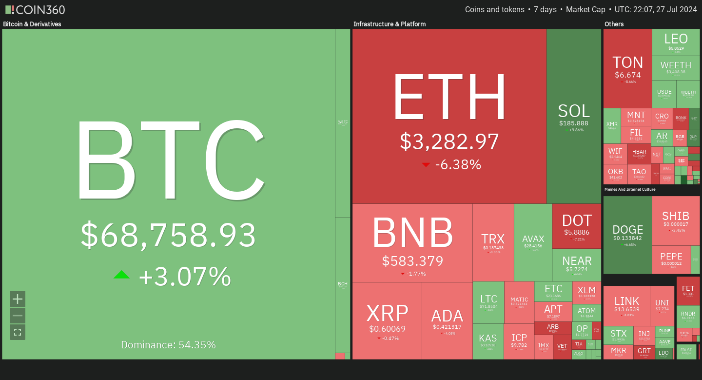 🔥🗺️ 7-day heatmap below, showing the current share of the market for the top cryptocurrencies, and their change in price over the last week.