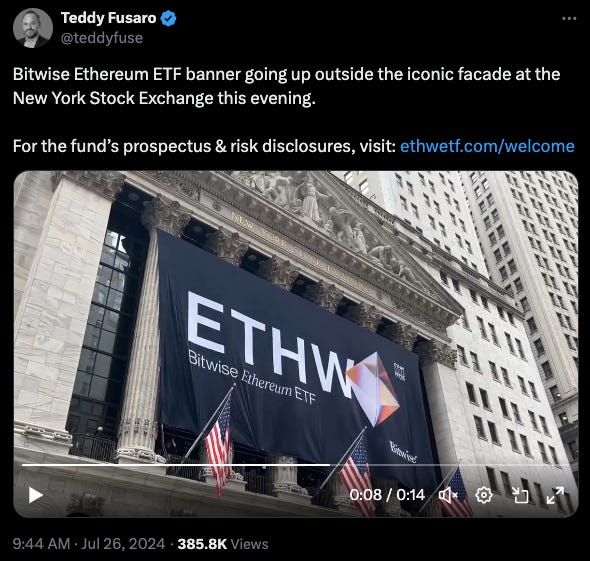 Ethereum ETFs launched with a bang this week, achieving $361 million in trading volume within the first 90 minutes. The surge reflects strong investor interest and confidence in Ethereum’s future, underscoring the growing acceptance of cryptocurrency-based financial products. The ETFs provide easier access to Ethereum investments, potentially attracting a broader range of investors. Despite this initial surge, Ethereum's price dropped 10% in the days following, a classic a "sell-the-news" reaction. (as well as overall market corrections, and broader economic pressures, including poor performances in the U.S. tech sector like Alphabet and Tesla).