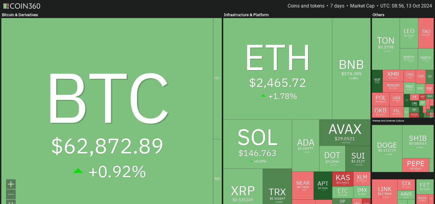 🔥🗺️ 7-day heatmap below, showing the current share of the market for the top cryptocurrencies, and their change in price over the last week.