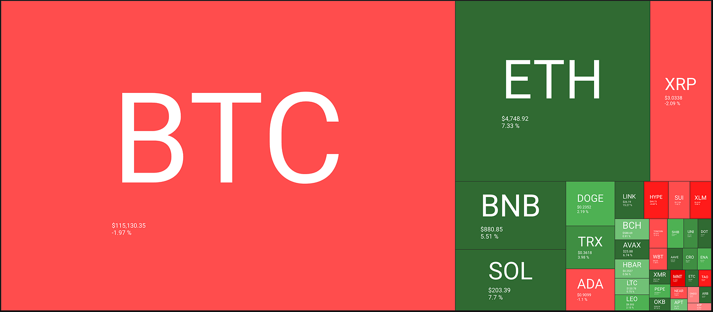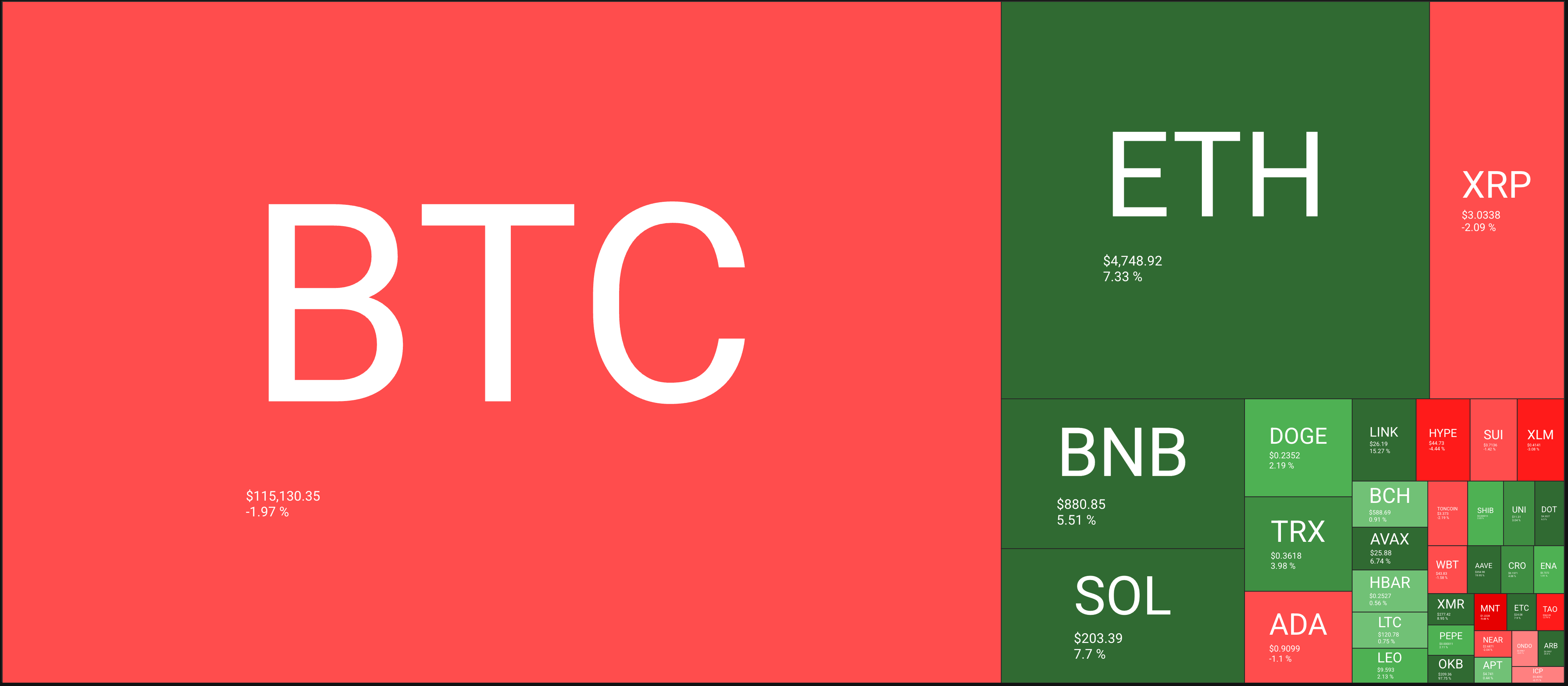 🔥🗺️Heat map shows the 7 day change in price (red down, green up) and block size is market cap.