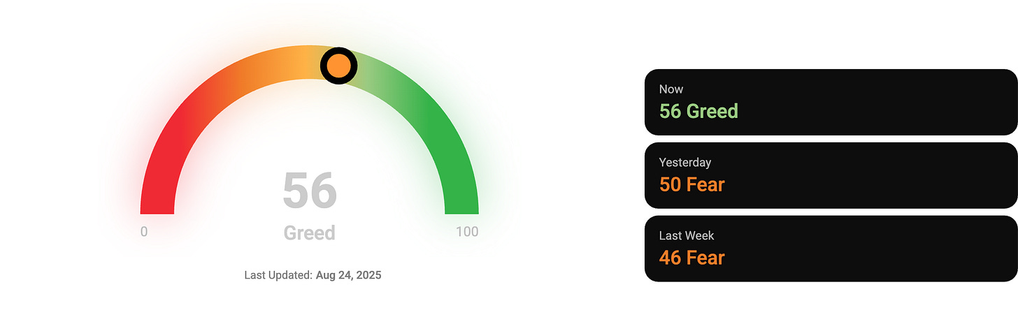 🎭 Crypto Fear and Greed Index is an insight into the underlying psychological forces that drives the market’s volatility. Sentiment reveals itself across various channels—from social media activity to Google search trends—and when analysed alongside market data, these signals provide meaningful insight into the prevailing investment climate. The Fear & Greed Index aggregates these inputs, assigning weighted value to each, and distils them into a single, unified score.