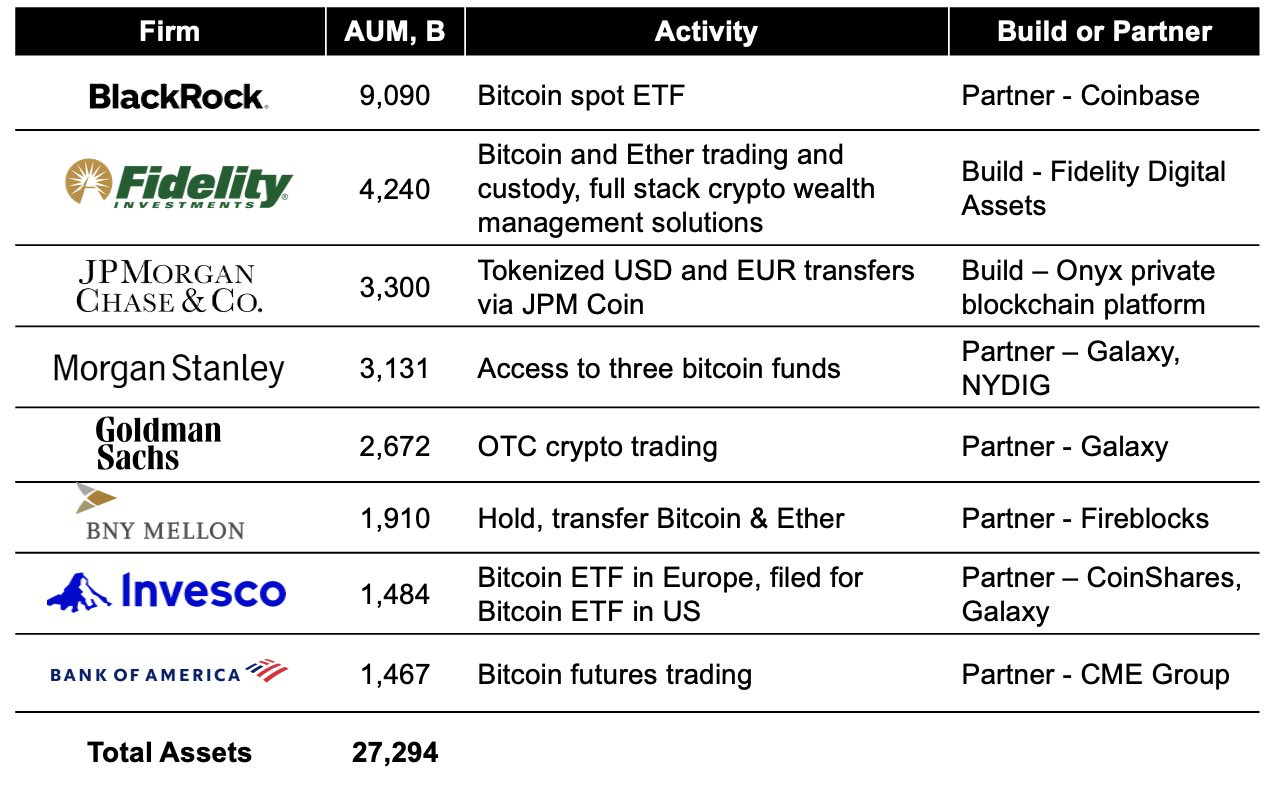 โฟ Institutional holdings of Crypto (esp Bitcoin) are increasing, they have been buying the dip. The 8 institutions below have over $27 Trillion worth of such assets under management (source)