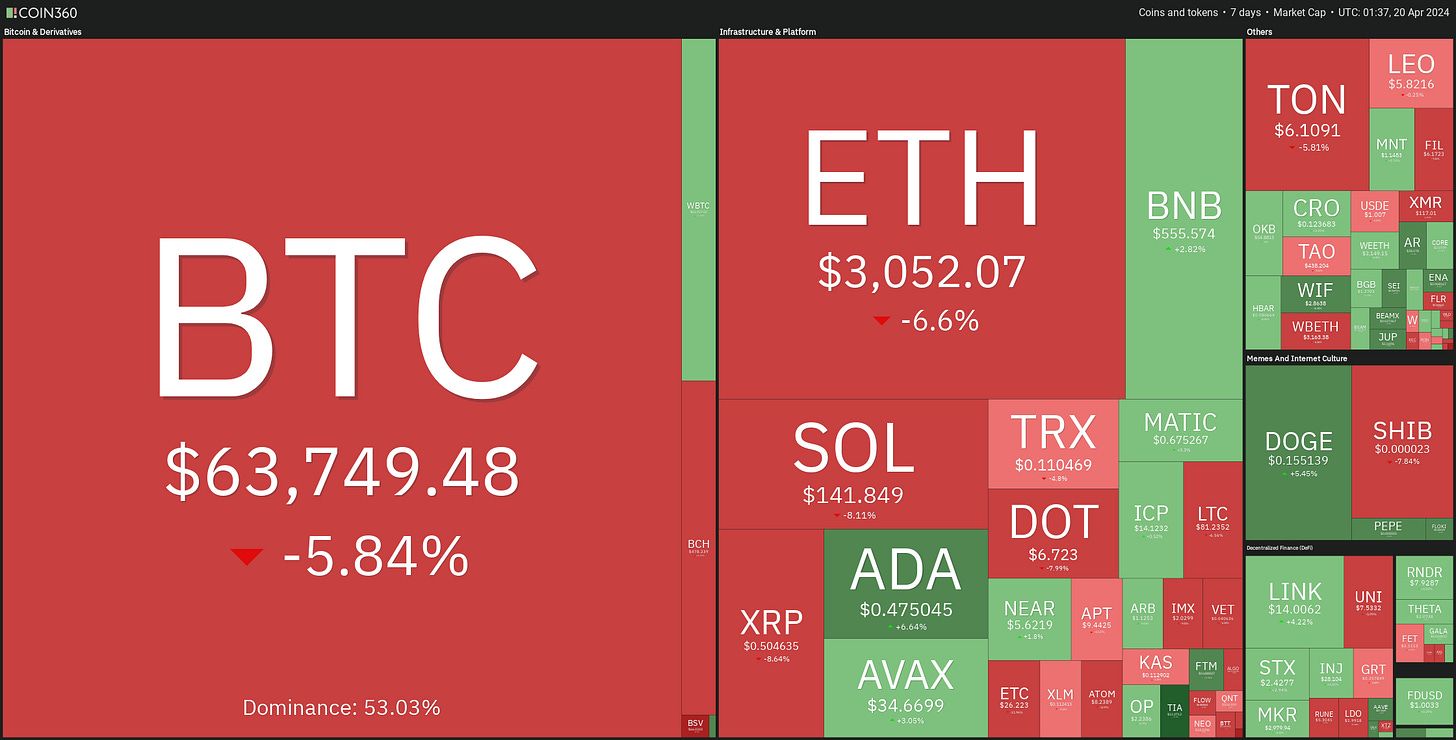 🔥🗺️ 7-day heatmap below, which shows the current share of market for the top cryptocurrencies, alongside total marketcap (USD) and the change in price over the last week. With the panic about Israel & Iran starting WW3, there have been more seller than buyers.