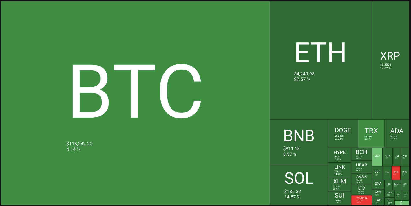 🔥🗺️Heat map shows the 7 day change in price (red down, green up) and block size is market cap.