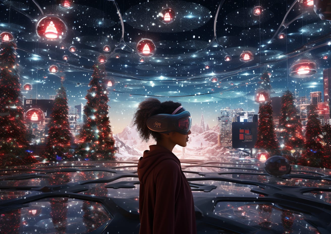 Image generated in Midjourney, prompt: “Christmas in the metaverse, digital --ar 14:10”