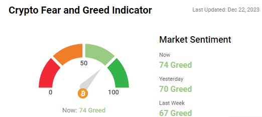 🎭 Crypto Fear and Greed Index is based on volatility, social media sentiments, surveys, market momentum, and a few other bits and pieces. Still in the Greed zone, no real change this week.