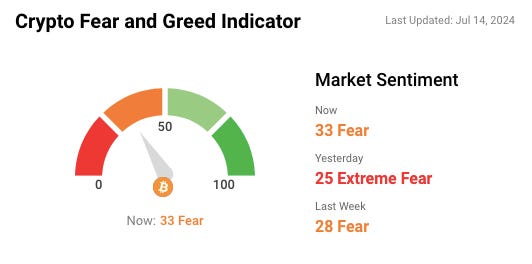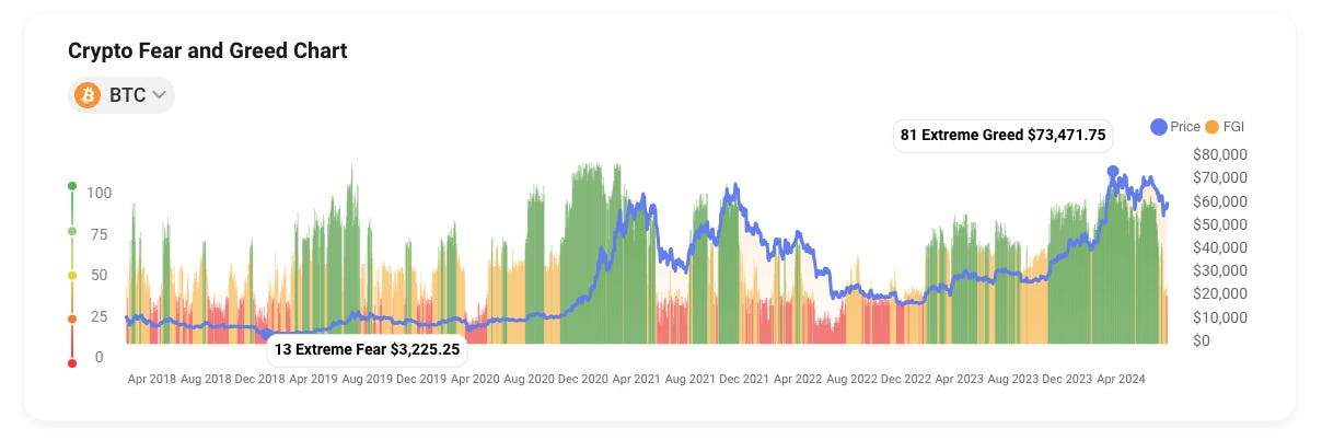 🎭 Crypto Fear and Greed Index is based on volatility, social media sentiments, surveys, market momentum, and a few other bits and pieces.