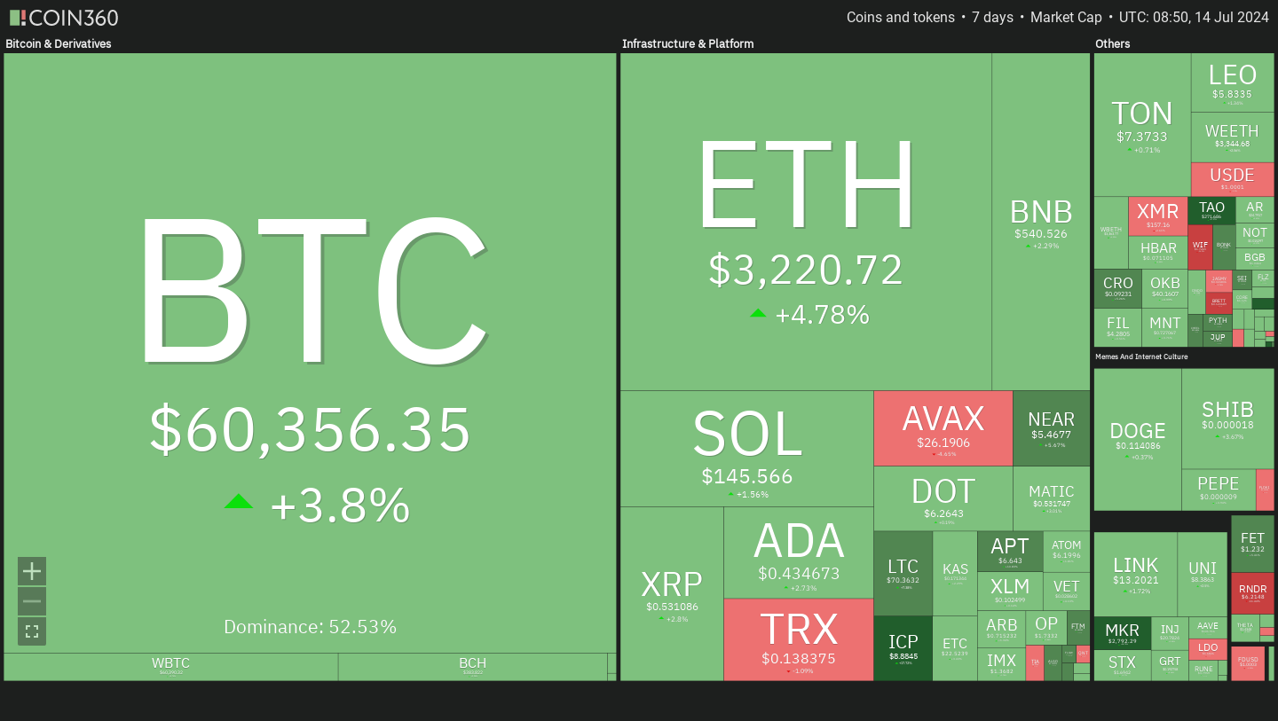 🔥🗺️ 7-day heatmap below, showing the current share of the market for the top cryptocurrencies, and their change in price over the last week. Germany had finished selling off the seized Bitcoin, fear is subsiding, and we are now ready to go higher.