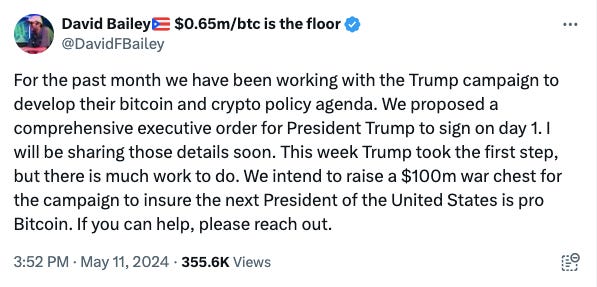 🇺🇸 As we get closer to elections in USA, its going to be interesting to see each candidates stance on Bitcoin and crypto. Looks like Trump might be friendly: