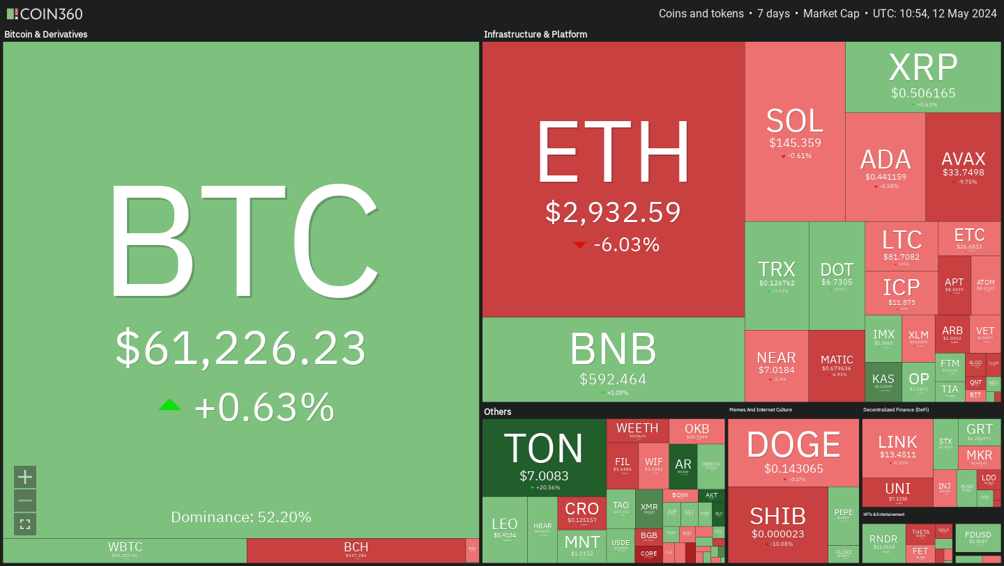 🔥🗺️ 7-day heatmap below, which shows the current share of market for the top cryptocurrencies, alongside total marketcap (USD) and the change in price over the last week. Volatile week but no real change.