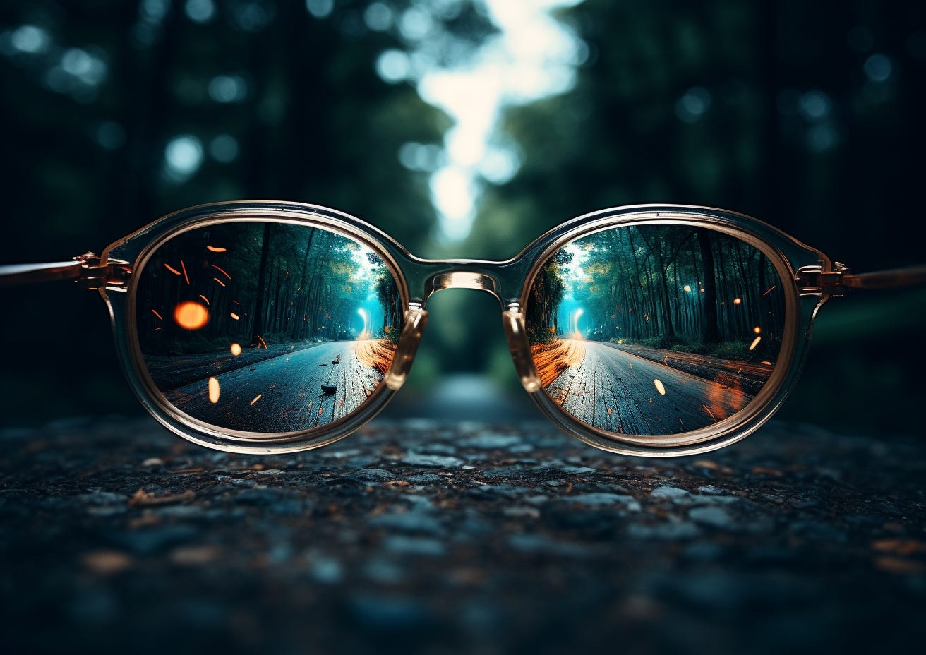 Image conjured in Midjourney, prompt: “looking through pair of glasses, path to the future --ar 14:10