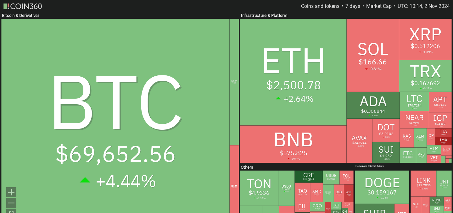 đ„đșïž 7-day heatmap below, showing the current share of the market for the top cryptocurrencies, and their change in price over the last week.