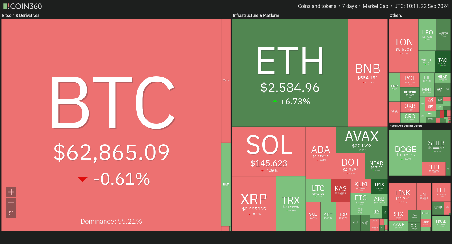 🔥🗺️ 7-day heatmap below, showing the current share of the market for the top cryptocurrencies, and their change in price over the last week. BTC relatively flat, while Eth is up.