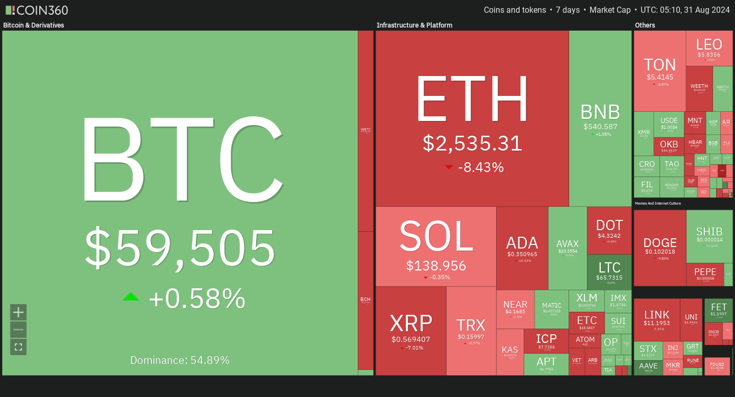 🔥🗺️ 7-day heatmap below, showing the current share of the market for the top cryptocurrencies, and their change in price over the last week.