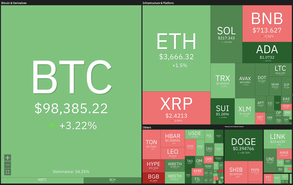 🔥🗺️ 7-day heatmap below, showing the current share of the market for the top cryptocurrencies, and their change in price over the last week.