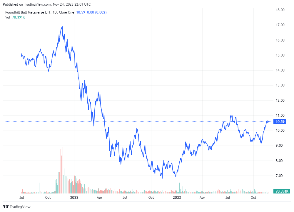 ⓂThe Roundhill Ball Metaverse ETF (METV) is climbing back up again. The METV aims to provide investors with a curated selection of companies poised to shape the future of the Metaverse. With a focus on the Ball Metaverse Index, it provides exposure to the evolving digital landscape. The fund, listed on NYSE Arca, has an expense ratio of 0.59%, AUM of $436 million, and 46 holdings. Top holdings include Roblox, Apple, Meta Platforms, NVIDIA, and Microsoft. As of today the ETF has a 1-year return of 28.39% (But -37.04% return since inception!)