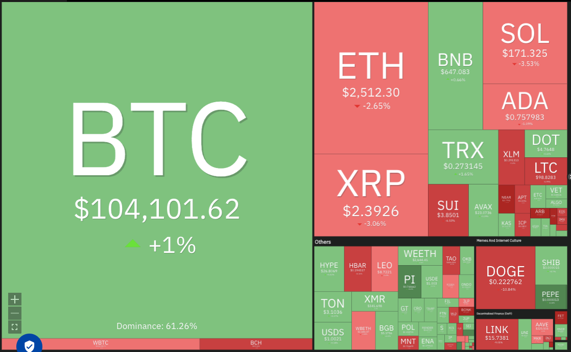 🔥🗺️Heat map shows the 7 day change in price (red down, green up) and block size is market cap. Bitcoin holding over USD$100k