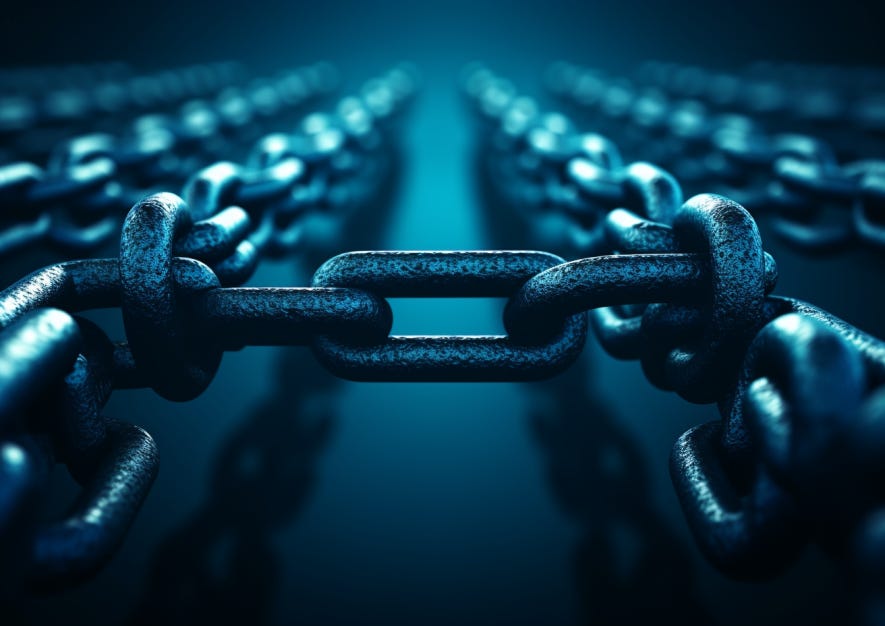 Image conjured in Midjourney, prompt: “chain links connecting 2 worlds --ar 14:10”