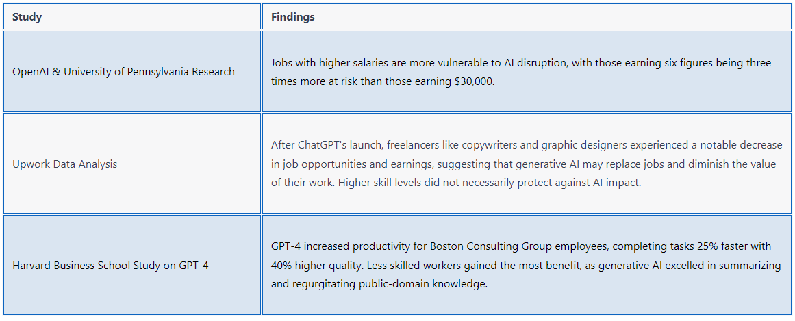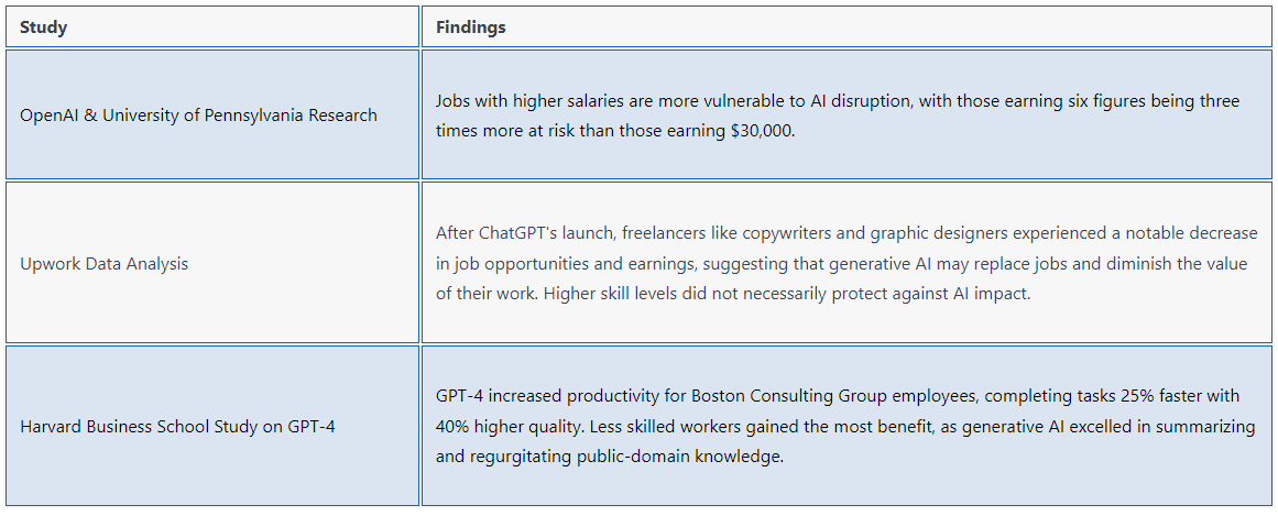 Generative AI, including ChatGPT, has sparked concerns over job security, particularly for high-earning freelancers. Research from OpenAI and the University of Pennsylvania reveals that jobs with higher salaries, particularly those earning six figures, are three times more susceptible to AI disruption. Freelancers on platforms like Upwork, especially copywriters and graphic designers, experienced a decline in job opportunities and earnings post-ChatGPT launch. Even highly skilled freelancers witnessed declines, challenging the notion that higher skill levels protect against AI impact. In contrast, a study on GPT-4's impact on Boston Consulting Group employees showed increased productivity, particularly for less skilled workers.