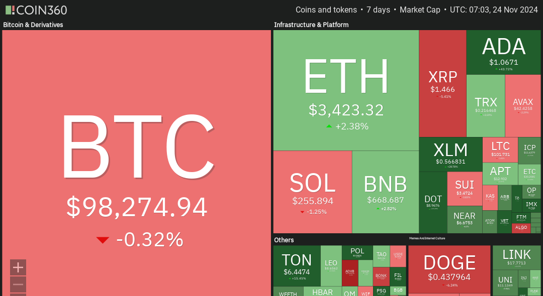 🔥🗺️ 7-day heatmap below, showing the current share of the market for the top cryptocurrencies, and their change in price over the last week. A sea of green this week.