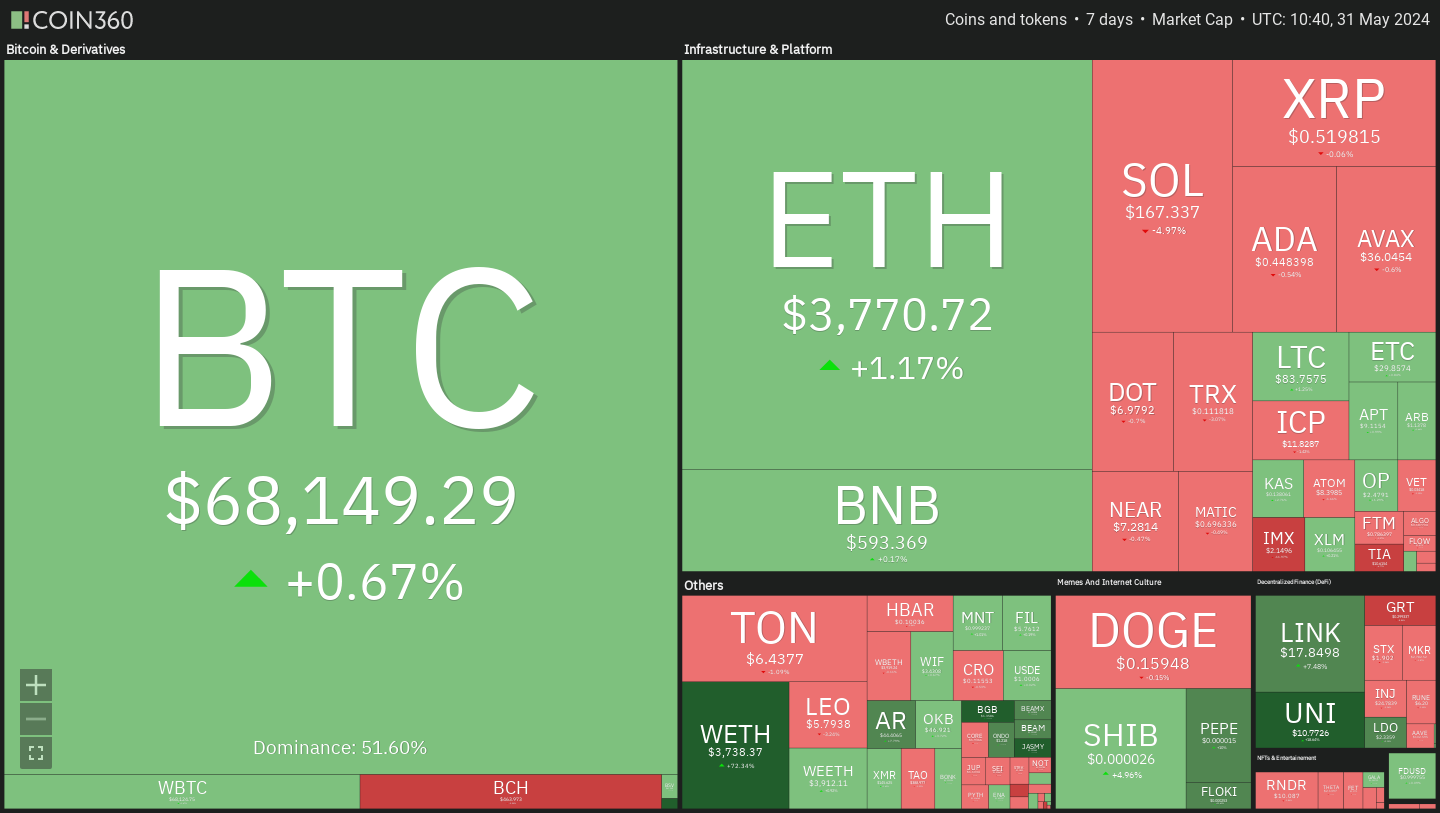 🔥🗺️ 7-day heatmap below, showing the current share of the market for the top cryptocurrencies, and their change in price over the last week.
