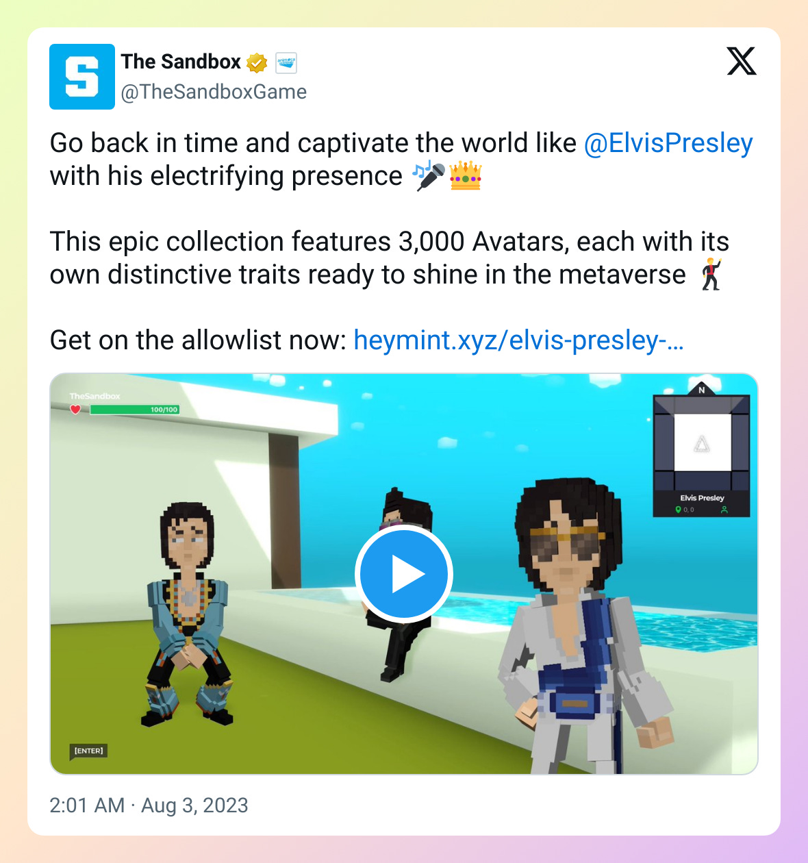 🎙️🕺🏻 The Ethereum metaverse game, The Sandbox, is launching 3,000 officially licensed Elvis Presley NFT avatars to celebrate his legacy. These avatars, minted on the Ethereum scaling network Polygon, will feature outfits and dance moves from different stages of Presley's career. They will be playable in future Sandbox multiplayer experiences (in the upcoming digital version of Graceland) and offer access to upcoming metaverse content. The public sale starts on August 9, with avatars split into four rarity levels, each priced at 100 SAND ($41).