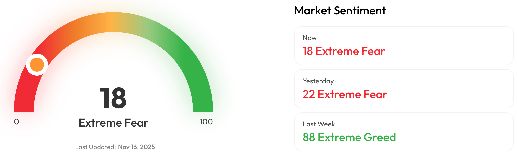 🎭 Crypto Fear and Greed Index is an insight into the underlying psychological forces that drive the market’s volatility. Sentiment reveals itself across various channels—from social media activity to Google search trends—and when analysed alongside market data, these signals provide meaningful insight into the prevailing investment climate. The Fear & Greed Index aggregates these inputs, assigning weighted value to each, and distils them into a single, unified score.