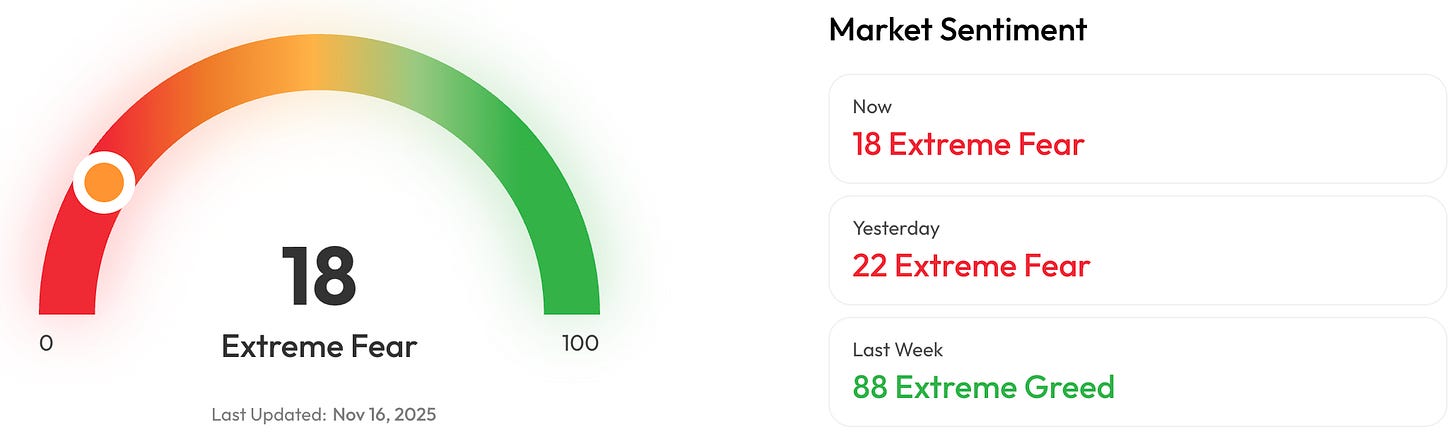 The crypto market has fallen sharply in November, with global capitalisation dropping from $4.28 trillion to $3.27 trillion in one month. Bitcoin is now 23 percent below its all-time high, while Ethereum has slipped 36 percent as selling pressure spreads across all major assets. The Crypto Fear and Greed Index dropped to 15, placing the market in extreme fear. This reflects growing investor anxiety and increases the likelihood of more downward movement.