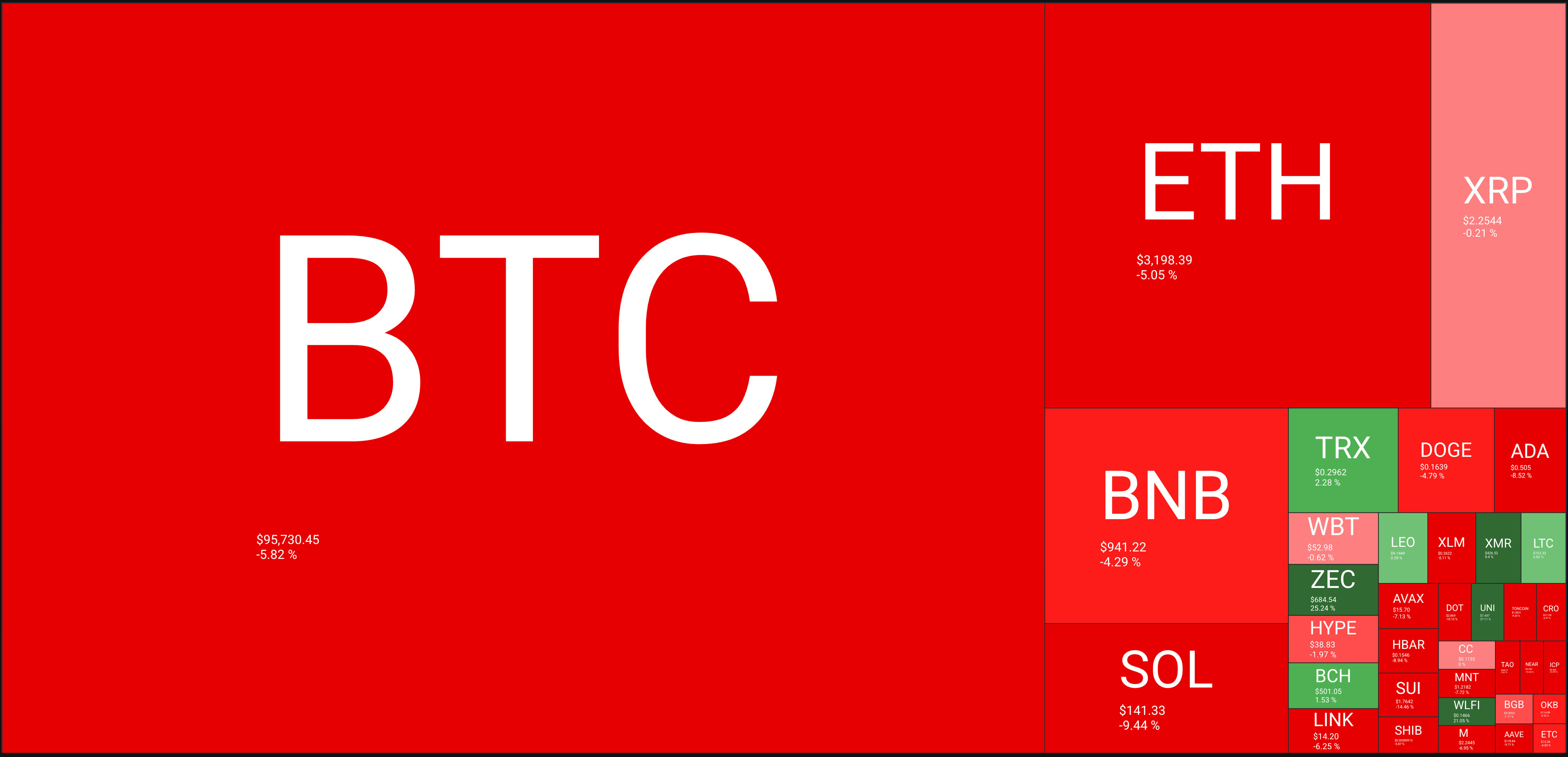 🔥🗺️Heat map shows the 7 day change in price (red down, green up) and block size is market cap.