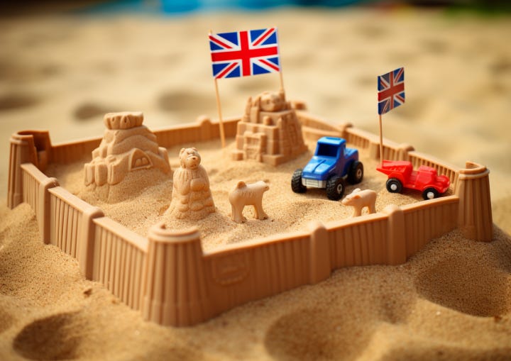 Image conjured in MidJourney, prompt: “a kids sandbox with symbols of the UK sticking out of the sand. --ar 14:10” (Unsure what strange creatures they are but hey why not)