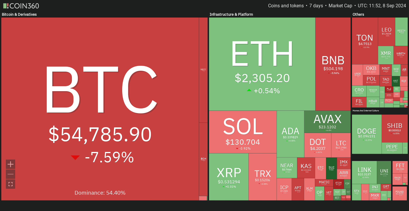 🔥🗺️ 7-day heatmap below, showing the current share of the market for the top cryptocurrencies, and their change in price over the last week. Nasty!