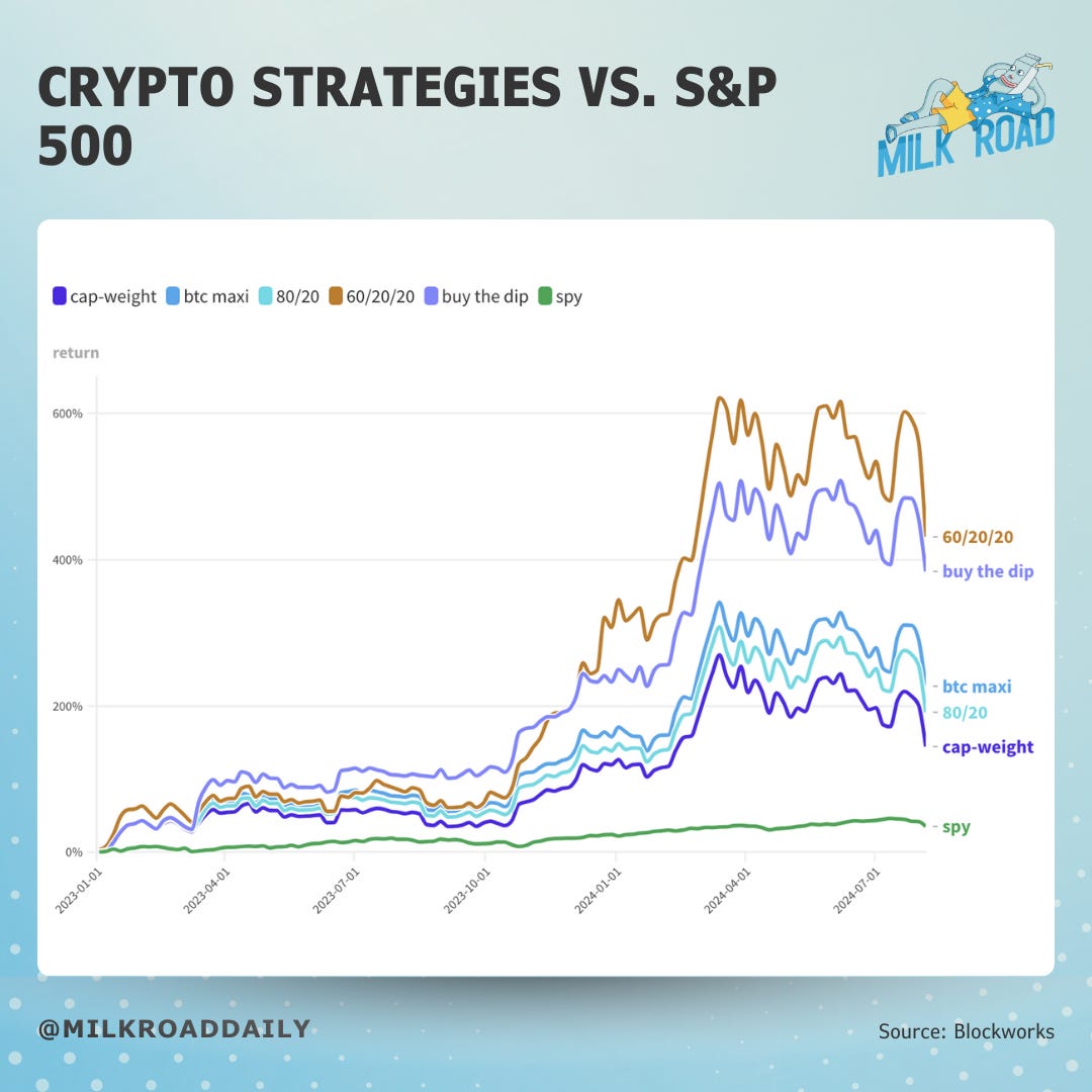 📈 This week, Mild Road published some backtesting data. Between January 2023 and August 2024, five distinct crypto investment strategies outperformed the S&P 500 by significant margins.